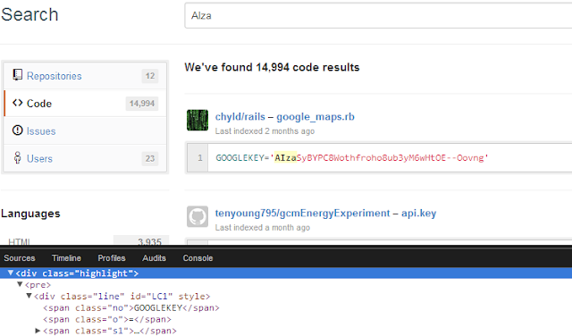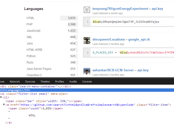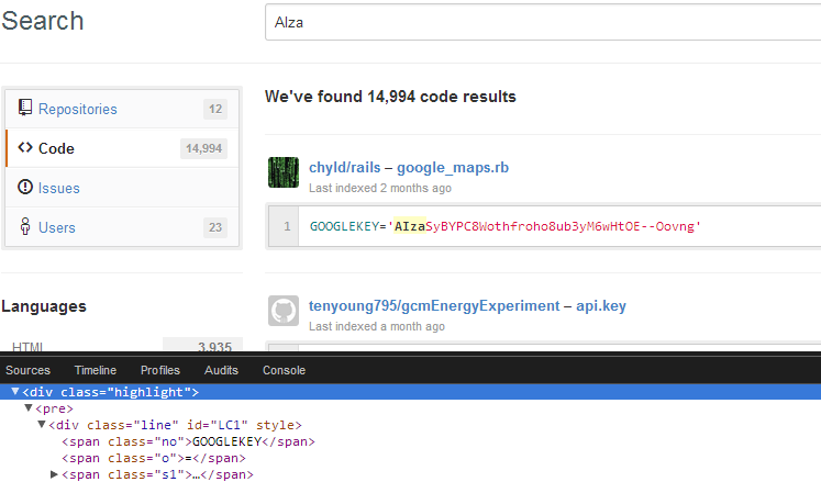 When I first acquired a Google API key, I quickly noticed that many (if not all) keys start with the same 4+ characters: "AIza". These keys can give access to any API services the owner of the key has activated. While they are not incredibly secret (I have seen many used in Javascript for the Maps API), and it's easy to replace them, they still aren't things the owners would likely want to be harvested. When the new Github search was introduced and the related private files started to be found, I decided to see if any developers had - intentionally or accidentally - left them in their code.
